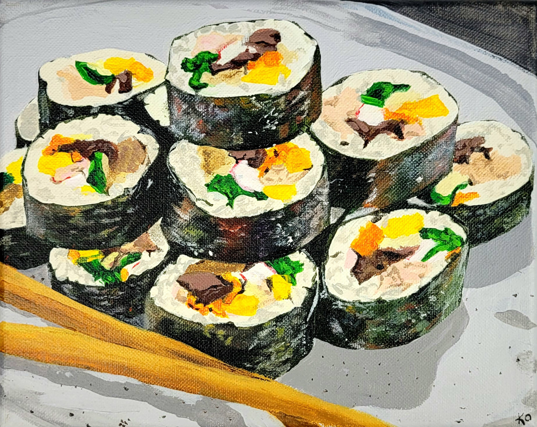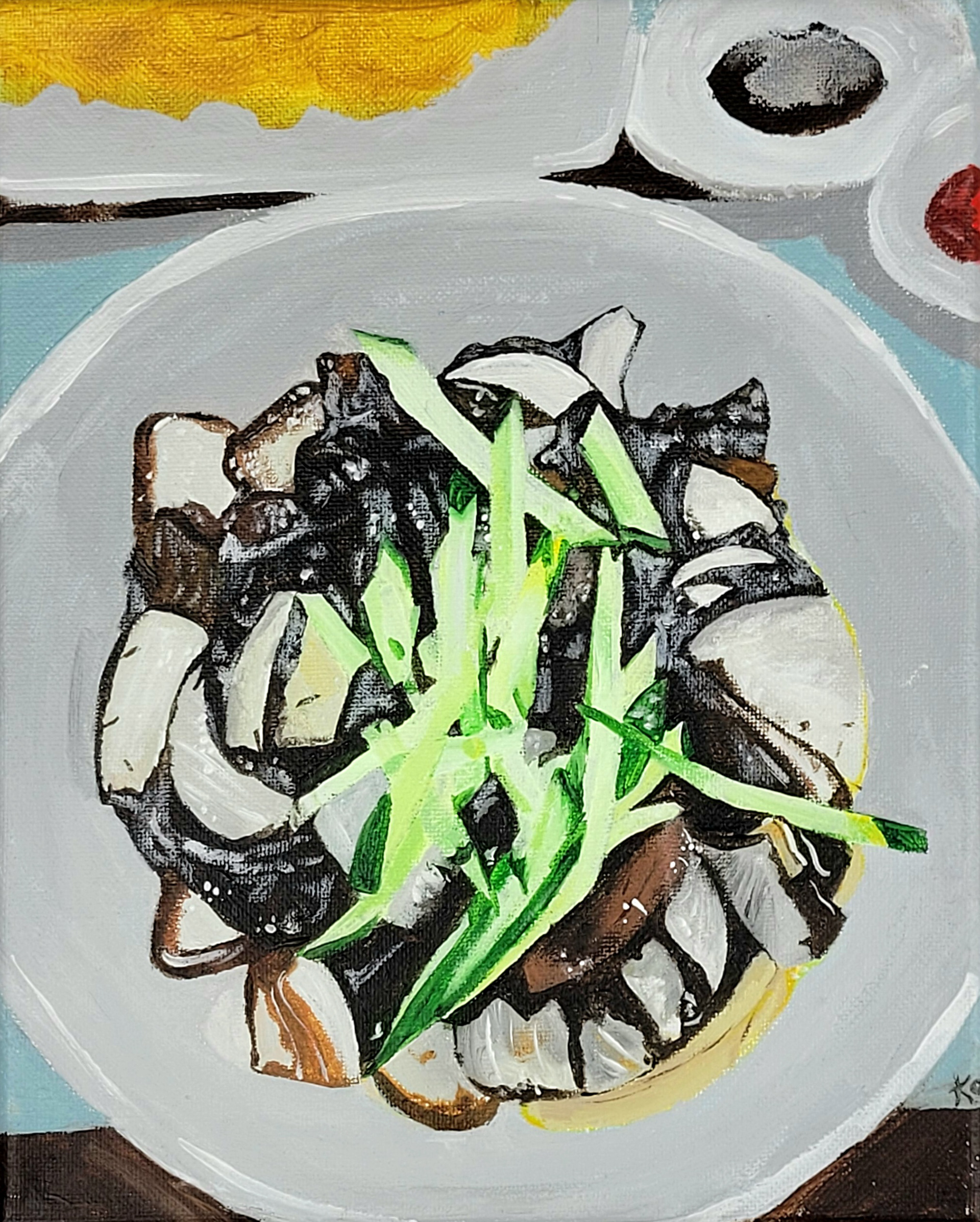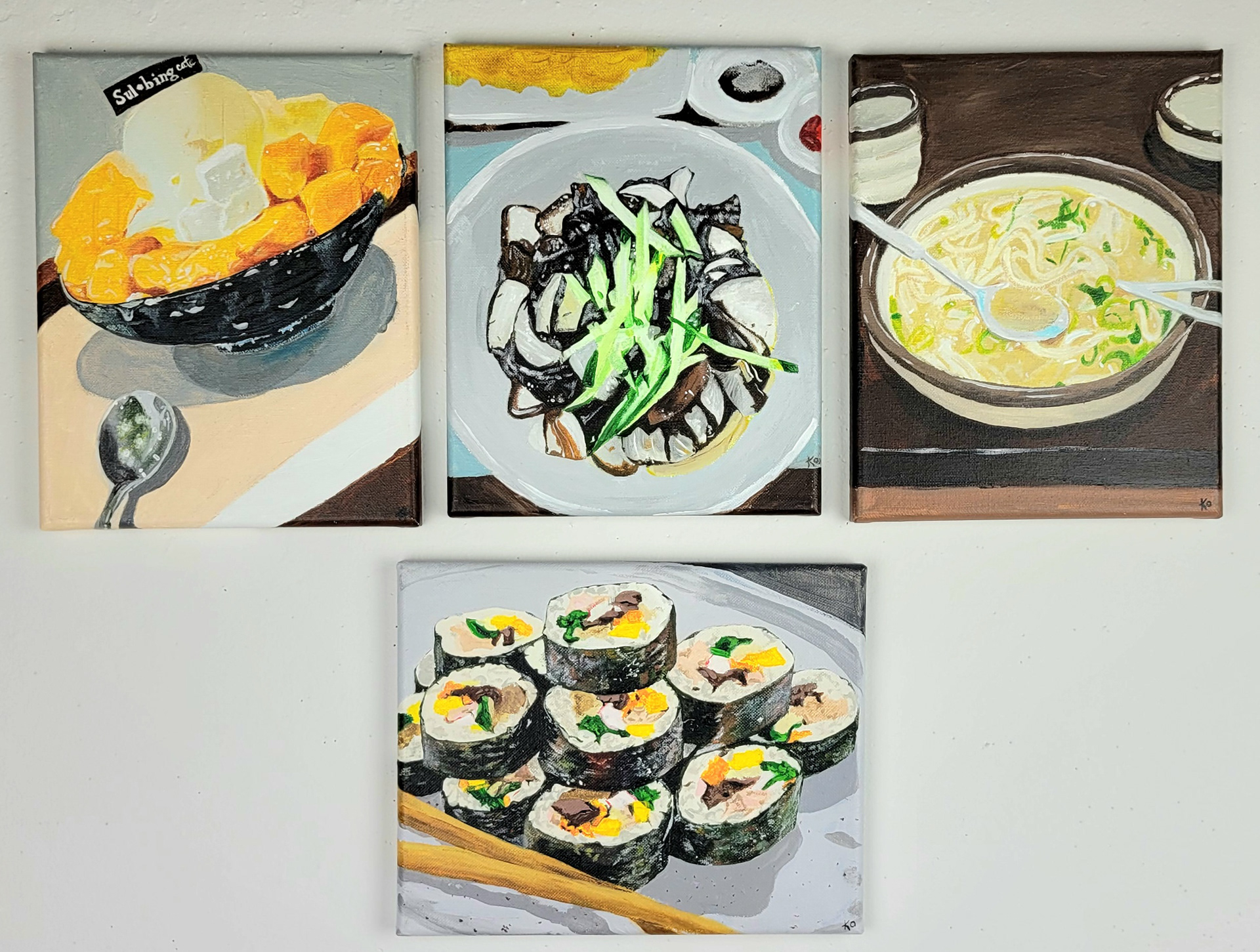 2021, 9"x 12", Acrylic Paint- Jajjang, Kimbap, Kalguksu, and Bingsu