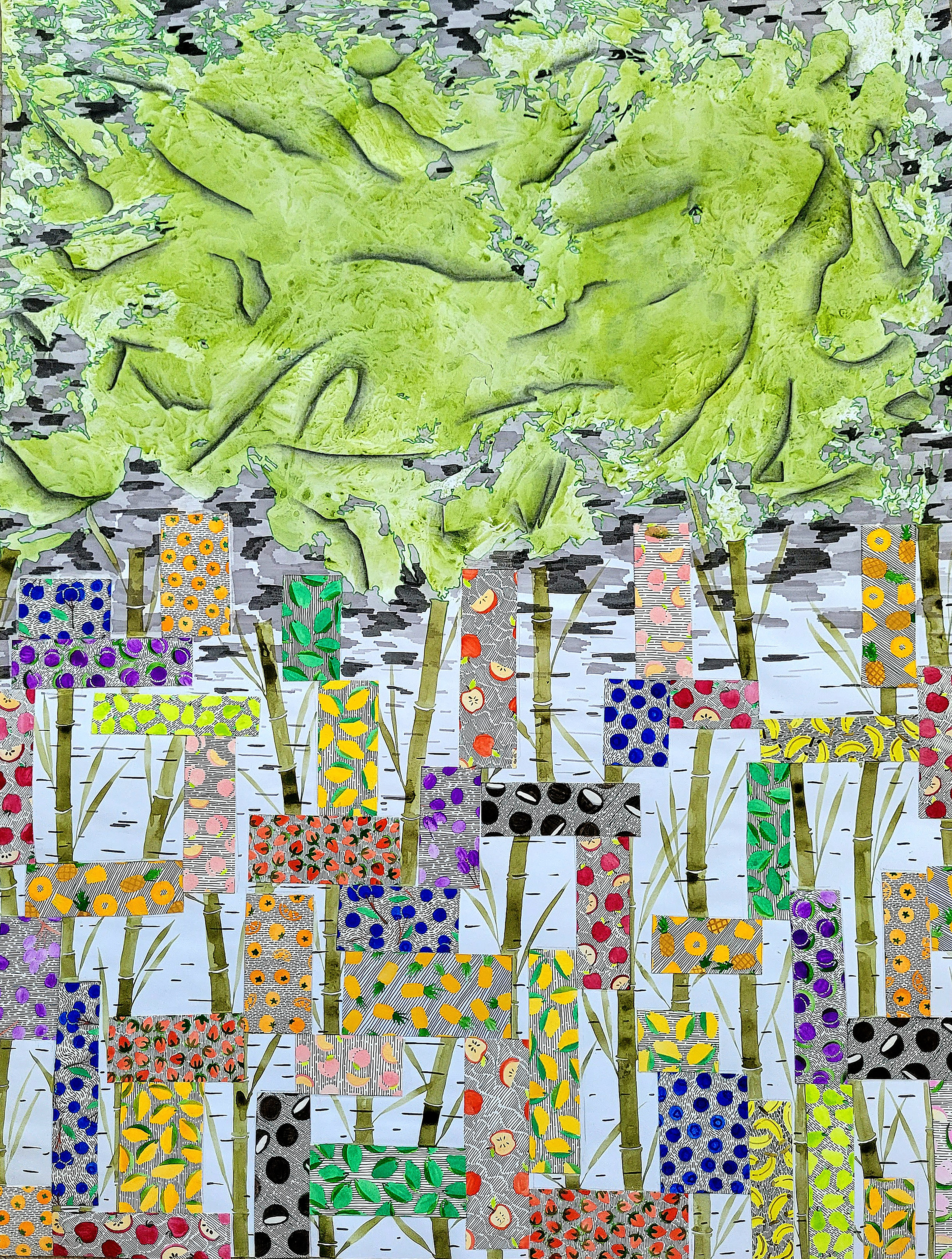2024, 23"x 40", Ink, Plastic wrap, Markers, pencils, Gouache, Microns, and Glue