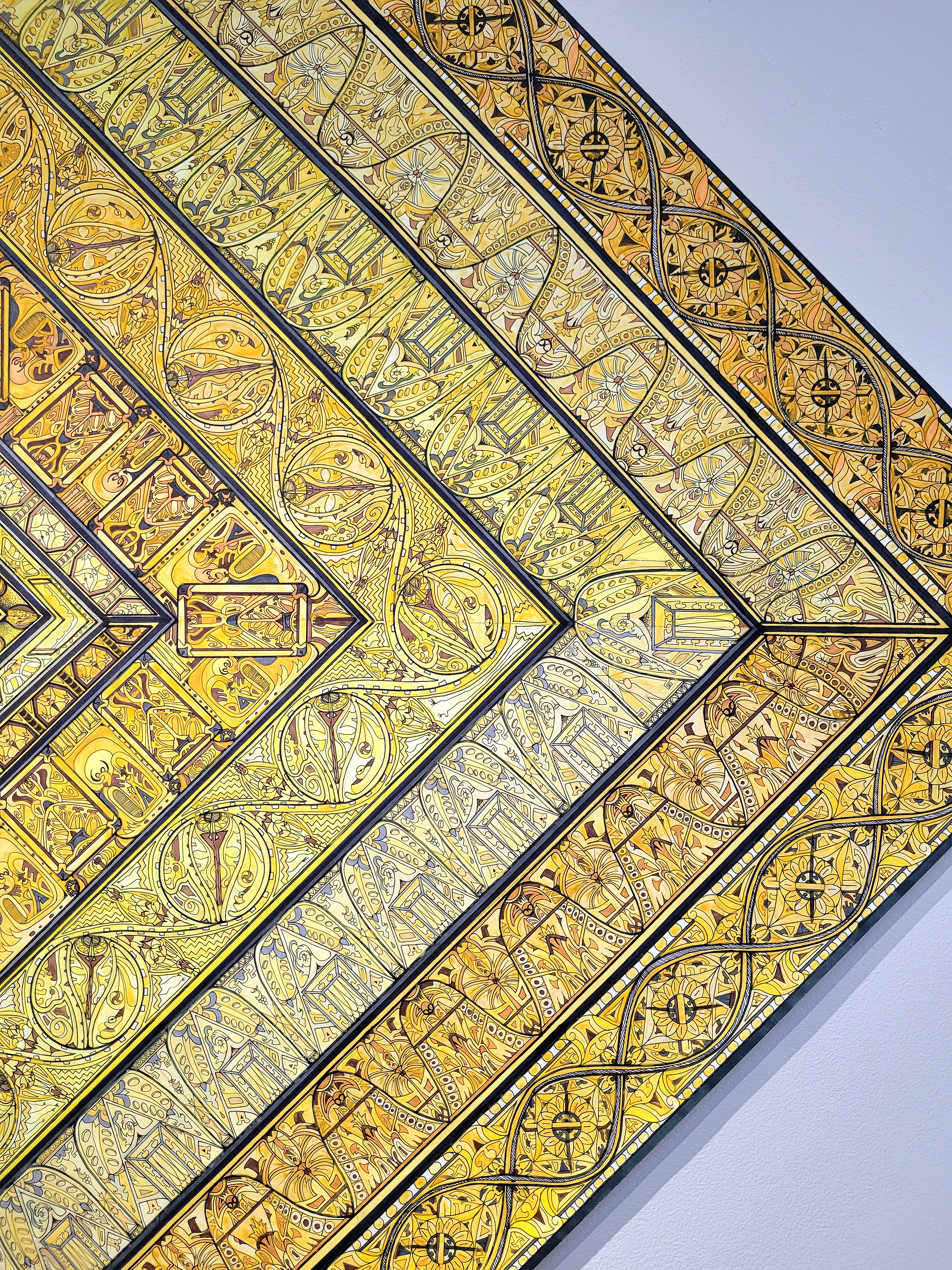Greedy Yellow, 2024, 45"x 45", Ink, Gouache, Watercolors, Markers, Colored Pencils, Microns